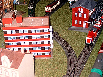 Dann wurden ein Bahnhof ein Bahnsteig, Lokschuppen und einige Häuser aufgestellt und fertig ist meine Spielanlage. In den nächsten Tagen werde ich mir die noch fehlenden Gleisstücke zulegen, so das der Gleisplan dann etwas besser für das Auge aussehen wird.