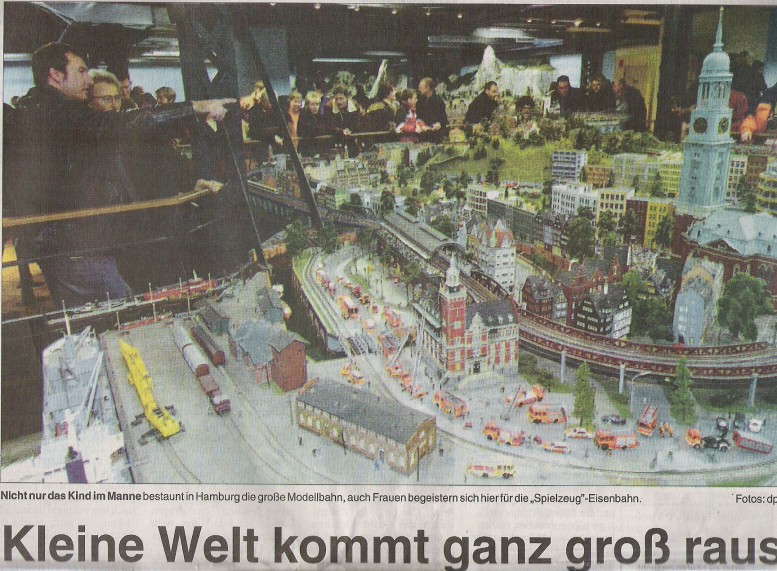 Heute, am 27.07.2005, war in der Tageszeitung NRZ = Neue Ruhr Zeitung in der Mittwochsbeilage REISE JOURNAL ein Bericht über das Miniatur Wunderland in Hamburg. Diesen Bericht möchte ich natürlich allen Freunden der kleinen Bahn nicht vorenthalten. Ich hoffe es ist noch lesbar.