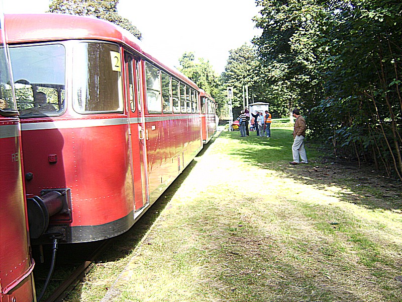 Nur alle Streckensignale und die ehemals für viel Geld gebauten automatischen Bahnübergänge funktionierten nicht mehr, so das vor jedem Bahnübergang zwei Leute den Verkehr sichern mußten. Mit der sagenhaften Geschwindigkeit von knapp 30 Km/h ging es um genau 16:30 Uhr vom alten Kreisbahnhof Richtung Neukirchen auf die Strecke. Insgesamt wurden 4 ehemalige Kreisbahn Bahnhöfe angefahren und wir waren pünktlich um 16:55 Uhr in Neukirchen Rathaus. Leider konnte man sich da nicht aufhalten, da der Bahnsteig sehr schmal war wie bei allen heutigen Haltepunkten, nur an einer Zwischenstation gab es noch einen richtigen Bahnhof mit Bahnhofskneipe, die einen sagenhaften Betrieb hatten. Auch standen unterwegs an der Strecke viele Leute die diesen seltenen Anblick regelrecht genossen.