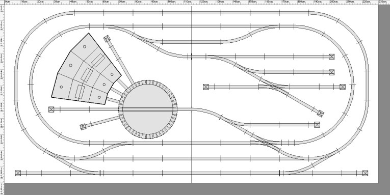 Bei diesem Probeaufbau hat sich gezeigt, das mir noch drei Weichen fehlen und einige Prellböcke. Aus diesem Grund wurde der rechte Bereich, also die Abstellgleise nicht mit aufgebaut. Der Plan hat sich als sehr gut herausgestellt und genau so wird die Anlage auch gebaut werden. Eine Änderung muß allerdings noch gemacht werden, das Abstellgleisrechts unten wird nicht gebaut, da ich auf der Platte noch Platz für die Stellpulte benötige. Auch der Lokschuppen wird wohl noch etwas auf sich warten lassen, aber den kann man ja auch noch nachträglich einbauen.