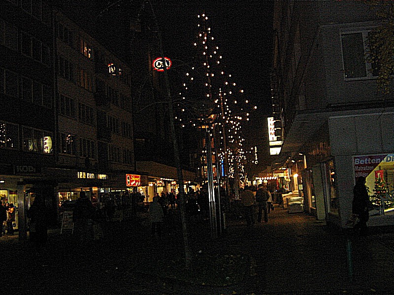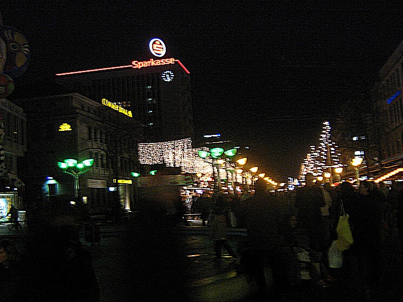 Also beginnt mein Bericht auf der Münzstraße,   bei C & A wo eine Kinder Autobahn und einige "Fressbuden" standen. Die Weihnachtsbeleuchtung allerdings ist gewöhnungsbedürftig. Die Münzstraße war schwarz vor Menschen und wir hatten alle Mühe da durch zu kommen. Ab Kuhtor begann der Weihnachtsmarkt mit einem sehr großen  Riesenrad  und eine "Fress-  und Saufbude" nach der anderen.  Man konnte dort von der 1/2 Meter Rostbratwurst, über Reibekuchen, Backfisch usw. sich richtig satt essen. Ich dachte schon das mal wieder ein Weihnachtsmarkt ohne Weihnachtssachen sei aber da hatte ich mich doch getäuscht. Es gab sogar reichlich Stände die Weihnachtssachen verkauften.