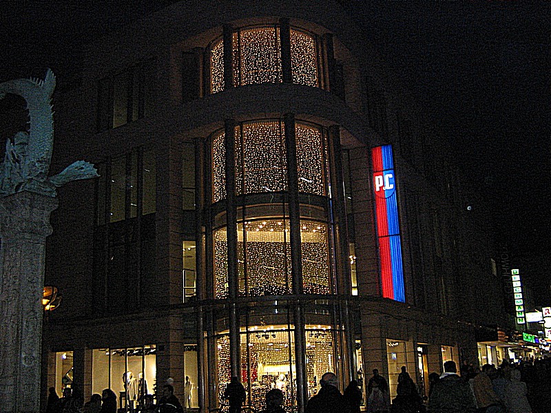 unter dem Weihnachtsbaum die ersten Buden mit Blick auf Peek & Cloppenburg